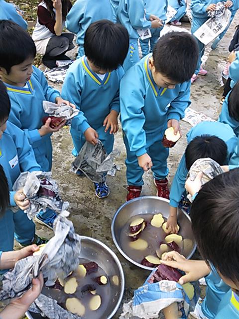 前に徳良湖から拾ってきた落ち葉を使って年長組でやきいもをしました!!
