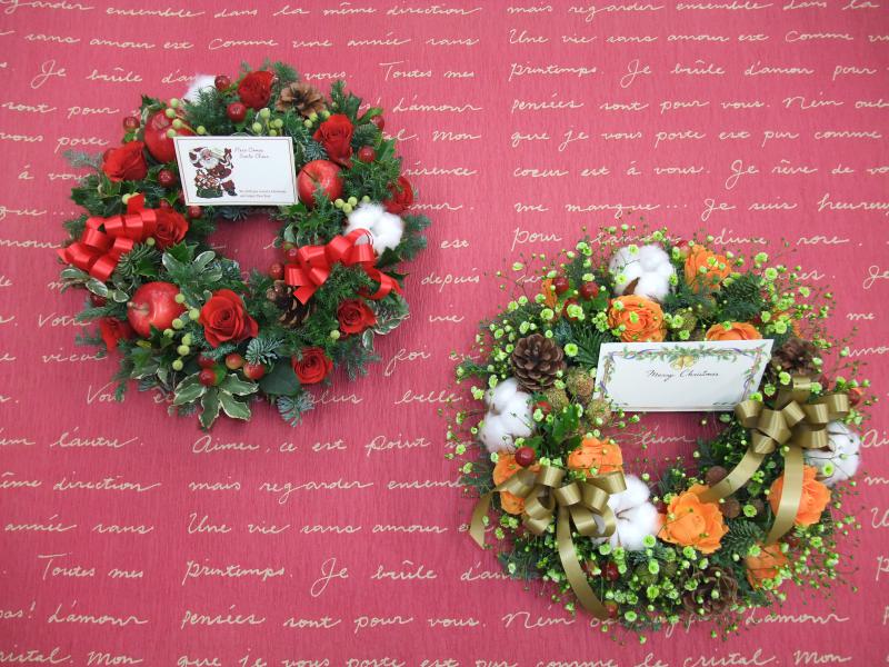 コットン、松ぼっくり、カラーかすみ草、ヒムロ杉、モミ、柊です。