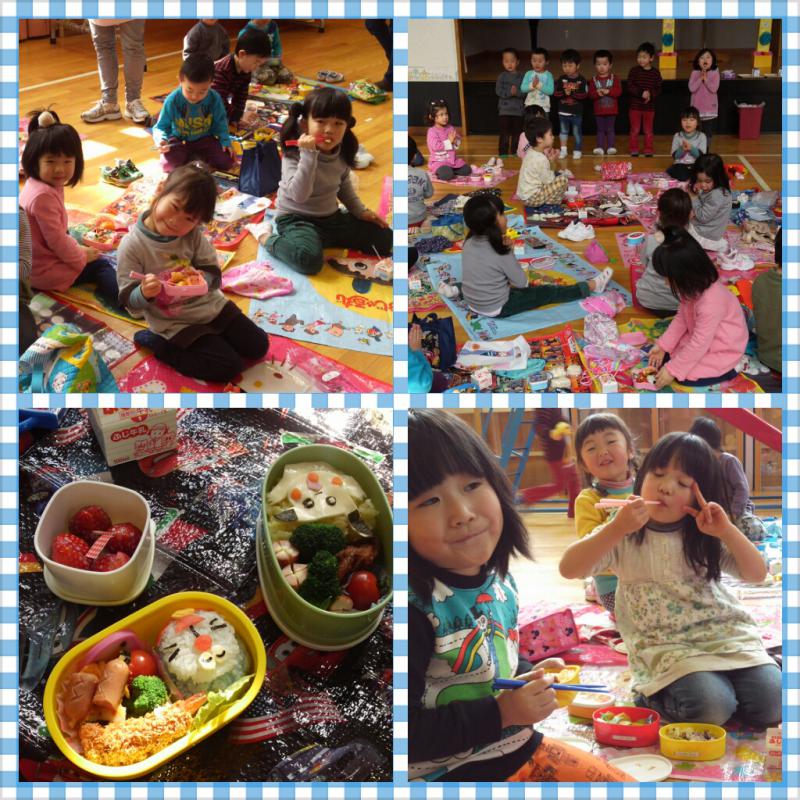 年少組みんなで、お遊戯室でお弁当を食べました(^o^)お当番サンが前に出て、いただきますのご挨拶♪