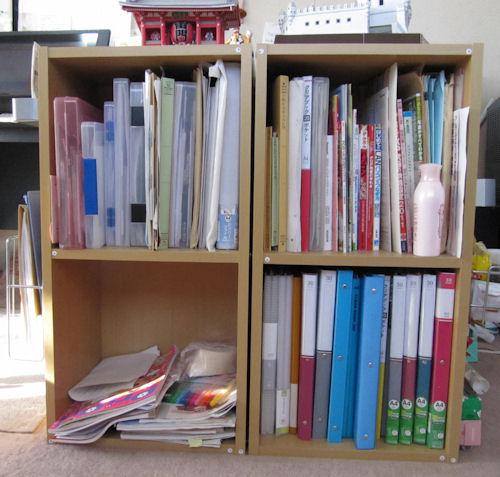 おとといニトリからカラーボックスMBCを買ってきました。ムサシとか見に行ったんだけど、ニトリのカラーボックスがサイズといい値段といい機能といいピッタリだったので購入!巾38p×高さ73pを2つ999円×2つ、それとこれがいいんですが、サイドに取り付けられるDVDラック、トレー、A4マガジンラックも購入してさっそく組み立てました。