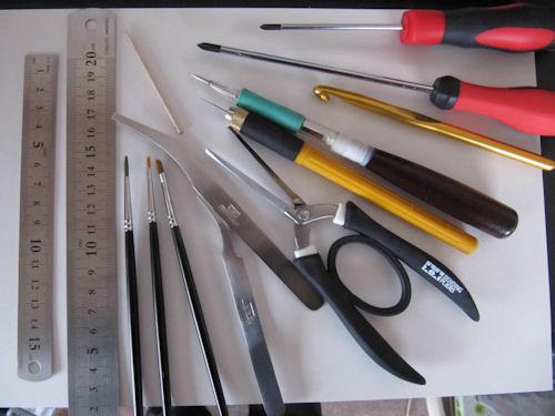 ペーパークラフトの作成に使っている道具だよ!ドライバーや編み棒は軸を使って紙を丸めます。ペンチみたいなのは、タミヤ模型から出ているエッチング用のエッチングベンダー。それと補正用の筆、あと、折り目をなぞる道具として、ボールペンの先と千枚通しを合体したものを自作して使っています。これなかなか便利。ボールペンの先は太すぎて、やりにくい。接着剤はボンド木工用プレミアム速乾チューブ入り。こんなとこかな。