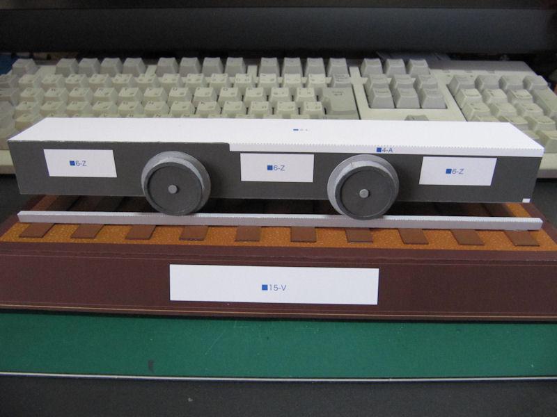 さっそく車輪を台車に取り付けてみました。レールから車輪が浮かないように微調整をして、4輪ともレールにピッタリついています。