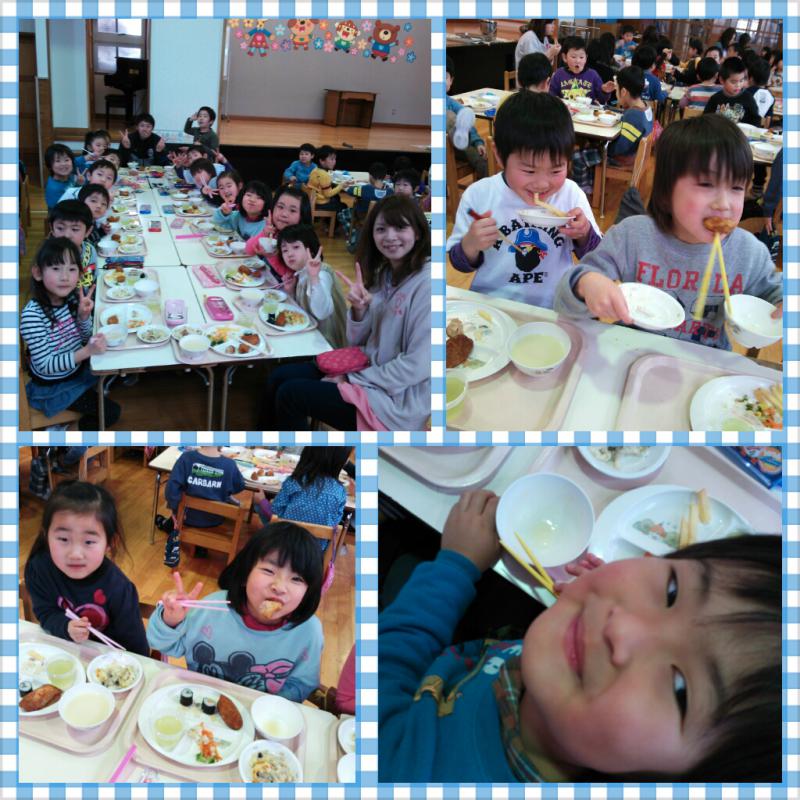 お口いっぱいに唐揚げをほおばりこの笑顔(^∀^)おかわりもたくさんしてバイキングを楽しみました♪