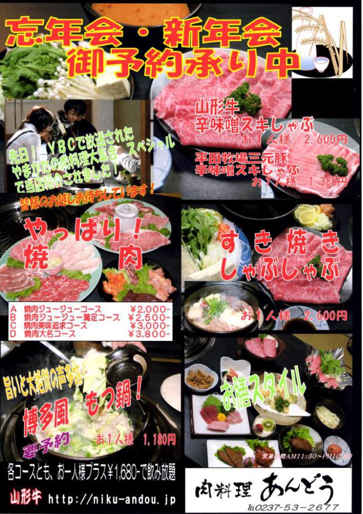 肉料理あんどう「忘年会・新年会ご予約賜り中」肉料理あんどうでは、ご予算・お好みに合わせた「忘年会・新年会」のいろんな企画をご用意して、皆様のお越しをお待ちしています。お電話・メール等で、お問い合わせください。素敵な仲間と、美味しい・旨い「山形牛」を食べて、お酒を飲んで至福の時、間違いなし、みんな笑顔になります(*^・^*)追伸、明日は、11月29日「いい肉の日」です。山形牛食べましょう!前夜祭で、本日食べるに来られる方大歓迎です\(^O^)/