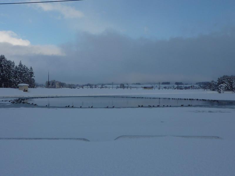 白鳥や、カモが、徳良湖の集落施設の所にいます。