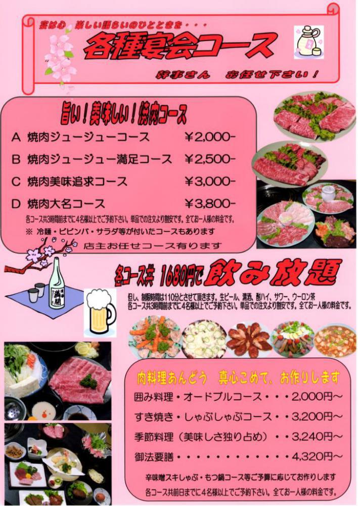 ●肉料理あんどう歓送迎会・花見の宴等の企画満載で皆様のお越しお待ちしています。