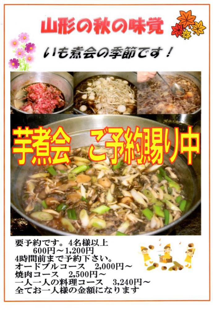爽やかな風が吹く季節になりました。山形名物の芋煮会の時機到来です!素敵な、仲間と楽しい語らいの時を肉料理あんどうで 山形牛で作った芋煮を食べながらお過ごしください。皆様のお越しお待ちしています。