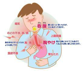 最近この病気の方が増えているようです。実はうちの身内にも、この病気と長年つきあっている者がおります。ひどい時だと、食べ物が胃に落ちていかず、食事をとれなかったり、夜中に胃液が上がってきて、もどしたりと、とても苦しんでいます。 どんな病気かというと、胃と食道の間にあって、胃液の逆流を防いでいる下部食道括約筋の働きが低下し、胃と食道のシャッターがキチッと閉まらない状態になってしまい、食物を分解するために胃で分泌している強烈な酸性の胃液などが食道に上がってきて、食道の粘膜を損傷してしまうというものです。 原因として、老化やストレス、不規則な食事(特に寝る直前に食事する)や脂っこい食事のとりすぎなどが上げられています。原因を見ると、最近若い人にも多く発症しているというのもうなずけますね! 対策として、医師の診断を受けて、お薬を処方してもらい、症状を和らげることもそうですが、日々の食事の内容や、食事をとる時間や量の調整は不可欠です。また、意外と盲点なのが、夜寝るときの寝姿勢です。胃液が上がってくるのを防ぐため、頭を高くして寝ること。枕を高くしたり、一番いいのは背上げできるベットを使用することです。これだけでも、夜、楽に眠れます。お試しください。イメージは下記田辺三菱製薬さんのHPから使用させていただきました。http://www.mt-pharma.co.jp/shared/show.php?url=../general/sick/gerd.html