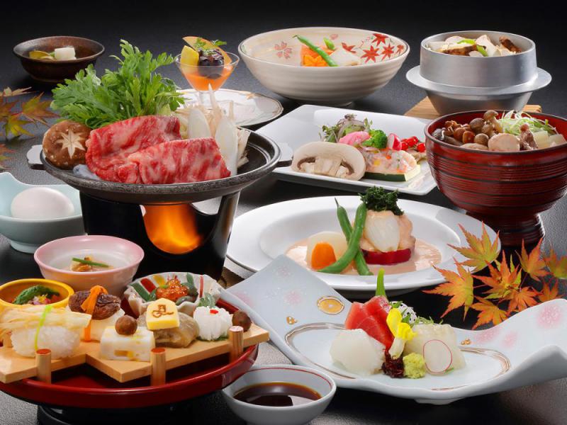 料金:お一人様14,040円(サ・税込)〜◆夕食お献立◆一、旬菜旬味盛合わせ 一、お造り三種盛り一、銀鮭煮付け一、特製割下の牛すきやき一、ずわい蟹のサラダ仕立て一、海の幸のフリカッセ一、山形名物 いも煮一、山形のお漬物一、松茸御飯一、柿プリン フルーツ飾り