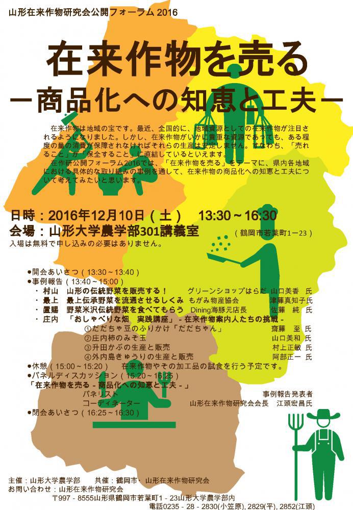 12月10日です!山形在来作物研究会公開フォーラム2016 のご案内 「在来作物を売る−商品化への知恵と工夫−」 主催:山形大学農学部、共催:鶴岡市・山形在来作物研究会 在来作物は地域の宝です。最近、全国的に、地域資源としての在来作物が注目されるようになりました。しかし、在来作物がいかに貴重な資源であっても、ある程度の量の消費が保障されなければそれらの生産は安定しません。すなわち、「売れること」が「保全すること」に直結しているといえます。 在作研公開フォーラム2016では、「在来作物を売る」をテーマに、県内各地域における具体的な取り組みの事例を通して、在来作物の商品化への知恵と工夫について考えてみたいと思います。 なお、フォーラムへの参加は無料で申し込みの必要もありません。○ と き: 2016年12月10日(土)13:30〜16:30○ ところ: 山形大学農学部301講義室(鶴岡市若葉町1−23)○ テーマ: 「在来作物を売る−商品化への知恵と工夫−」○ 日 程: ●開会あいさつ(13:30〜13:40) 山形在来作物研究会会長 江頭宏昌 ●事例報告(13:40〜15:00)(各地域20分×4=80分) 1.村山 在来野菜を売る! (株)グリーンショップはらだ 山口美香さん 2.最上 最上伝承野菜を売るしくみ (株)もがみ物産協会 津藤真知子さん 3.置賜 米沢伝統野菜を食べていただく知恵 Dining海豚(いるか)元店長 佐藤 純さん 4.庄内 「おしゃべりな畑 実践講座」 −在来作物案内人たちの挑戦− @だだちゃ豆のふりかけ「だだちゃん」 齋藤 至さん A庄内柿のみそ玉 山口美和さん B升田かぶの生産と販売 村上正敏さん C外内島きゅうりの生産と販売 阿部正一さん ●休憩(15:00〜15:20)(20分) 休憩時間に何種類かの在来作物やその加工品の試食を行う予定です。 ●パネルディスカッション(15:20〜16:25)(65分) 「在来作物を売る−商品化への知恵と工夫−」 ・パネリスト 事例報告発表者 ・コーディネーター 山形在来作物研究会会長 江頭宏昌 ●閉会あいさつ(16:25〜16:30) 山形在来作物研究会副会長 平 智