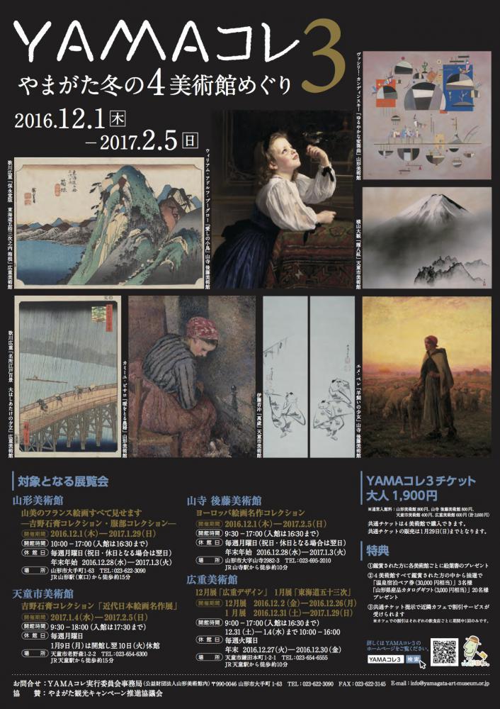 新年おめでとうございます本年もよろしくお願いいたします年が明け【YAMAコレ3〜やまがた冬の4美術館めぐり〜】が本格的にスタートしました。YAMAコレとは、山形市・天童市の美術コレクションを同時期に一斉に展示するという催しで、4つの美術館が参加しています。山形美術館「山美のフランス絵画すべて見せます」山寺 後藤美術館「ヨーロッパ絵画名作コレクション」天童市美術館「吉野石膏コレクション近代日本絵画名品展」広重美術館「東海道五十三次展」各館をめぐることで、17世紀頃〜近代までの西洋と日本の美術の流れをご覧いただくことができます。期間中はお得な共通チケットも販売しています(各館で購入可)。この機会に多くの方にお楽しみいただければと存じます。※休館日、展示期間は各館で異なりますので、お出かけ前にご確認ください。
