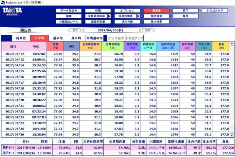「TANITA Inner Scan 50 BC-309」 何年か前に購入したヘルスメーターです。SDメモリーカード内蔵で、パソコンに記録を表示する事ができます。この表がパソコン表示の画面です。ダイエットに役立っています。体重の表示は50g単位まで表示されます。缶ビール1本飲んだだけでも表示が変わります。これがダイエットにはいいみたい。この表では2017/04/12の78.70sから2017/04/26の76.64sと2.06s体重が減りました。やったね!アマゾンで検索したら、まだ販売していました。16,780円でした。アマゾン的には★★★★★です。買ってよかった。