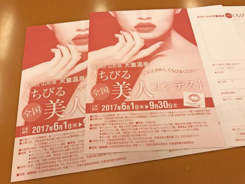 応募受付開始から約2カ月で当館の応募BOXにもたくさんのエントリー用紙が集まっているようです♪それぞれの賞の受賞者には天童市ならではの副賞もあるようなので、まだエントリーされていない方はお早めにご応募くださいませ♪応募〆切は9/30までですよ!【くちびる美人コンテスト】応募方法:天童温泉の各旅館に備え付けの応募用紙に、ご自身のリップマークを転写いただき、その他必要事項をご記入の上応募箱にお入れください。応募コース:ベストリップ賞、チャイルドリップ賞、ダンディリップ賞など賞品:応募コースに合わせて賞金や副賞が授与されます天童市観光協会 http://bussan-tendo.gr.jp/db/?d=7814 美味求真の宿 天童ホテルhttp://www.tendohotel.co.jp/