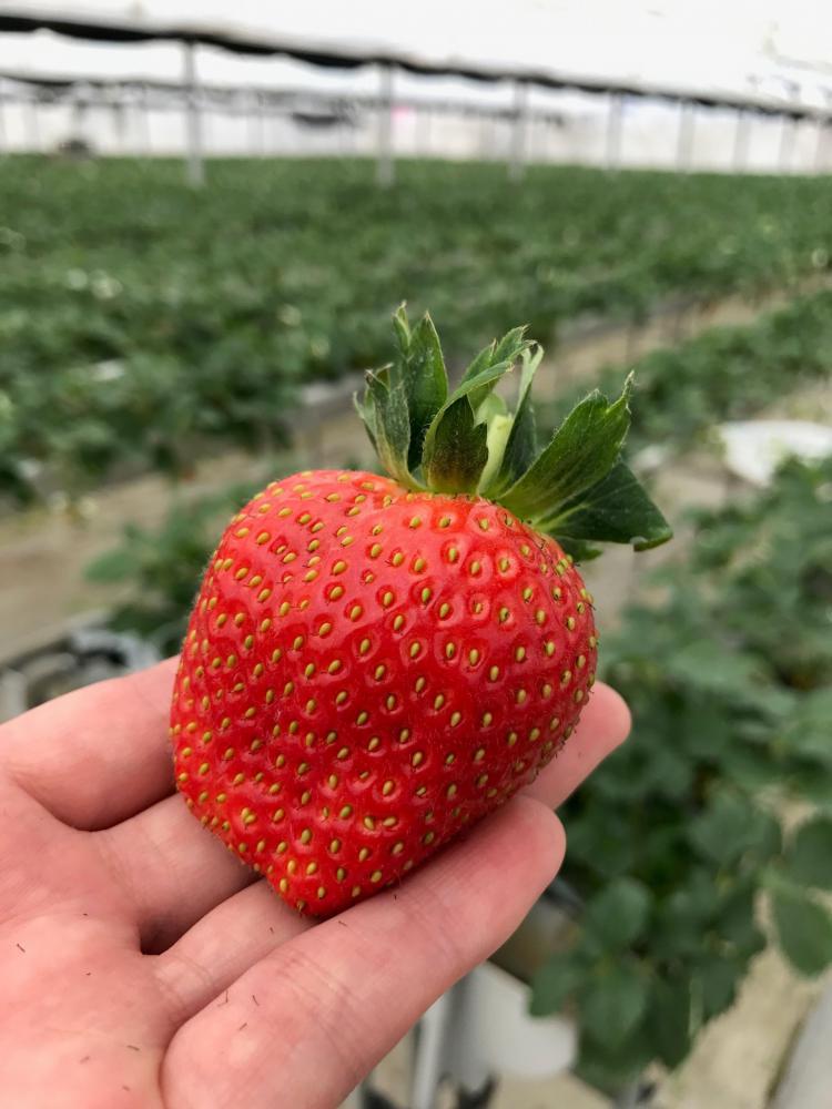 寒河江市のいちご園「ストロベリーファーム」さんへ見学に行って参りました。12月19日のいちご園オープンに向けて、いちごはぐんぐん生育中でした。見てください!この大粒のいちご。私の手が小さいのではなく、いちごがでっかいんです!中まで赤くて、とても甘かったですよ〜♪ストロベリーファームさんには、5種類のいちごが約3万株栽培されています。色づき中のものもたくさんありました。いちごは下から色づいていくんですね。いちご園は再来週オープンです! >>いちご狩りがセットになった宿泊プラン 美味求真の宿 天童ホテル 公式HPhttp://www.tendohotel.co.jp