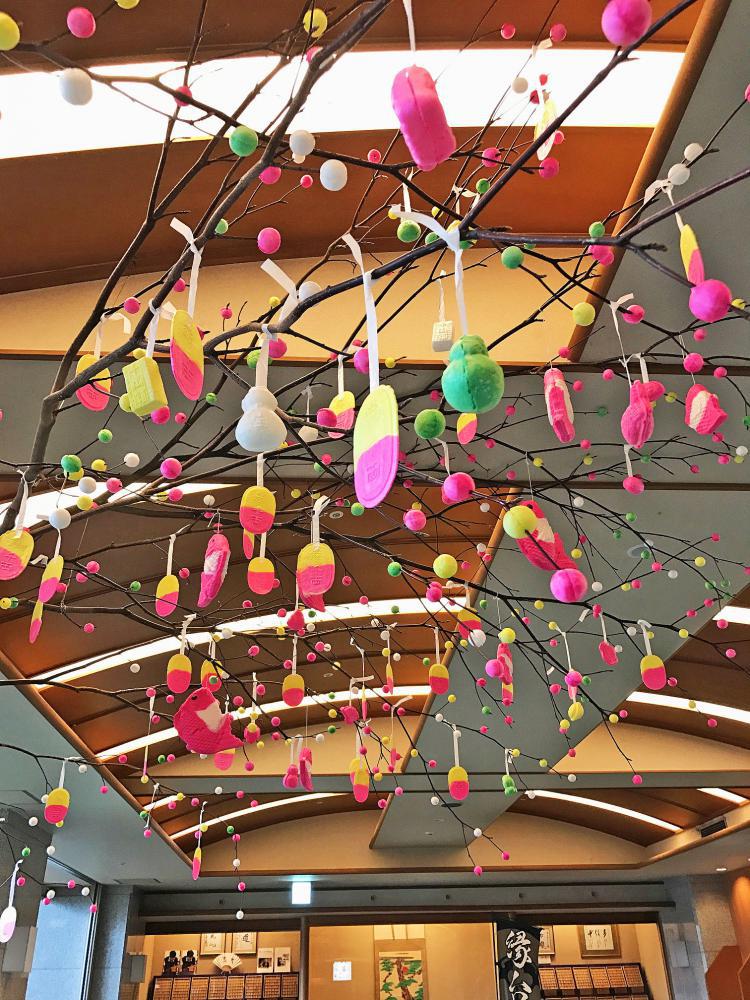 山形県では小正月になると木の枝に団子や鯛、小判の形をした色とりどりの「ふなせんべい」を飾る「だんごさし」が行われます♪最近ではだんご木を飾るご家庭も少なくなってきておりますが、当館ロビーでは五穀豊穣、商売繁盛、一年の無事を願い「だんご木」を飾っております。今年は飾り付けたスタッフ達の思いが強いのか、、、例年以上に華やかになっております。当館へお越しの際は目線をちょっとだけ上に向けてご覧下さいませ♪美味求真の宿 天童ホテル 公式HPhttp://www.tendohotel.co.jp