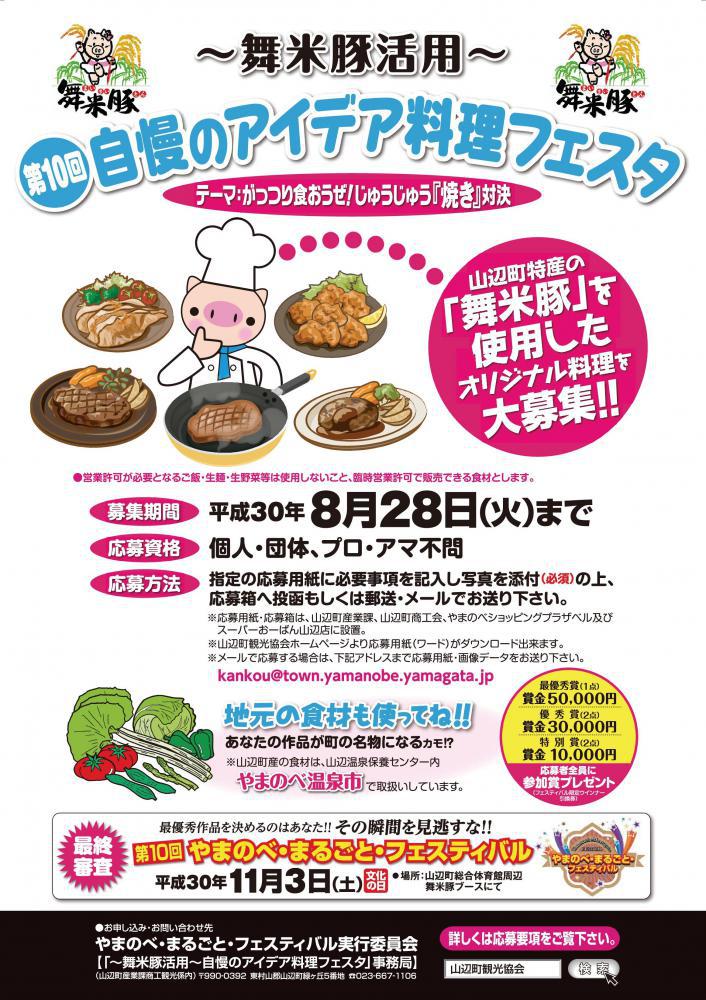 第10回「自慢のアイデア料理フェスタ」の参加者を募集します。今回募集する料理のテーマは「焼き」調理です。舞米豚を使った焼き料理のアイデアレシピの応募をお待ちしております。 ※ご飯や生麺などの営業許可が必要になる食材は使用できません。 ※臨時営業許可で販売できる内容とします。 募集期間 平成30年8月28日(火)まで 料理テーマ がっつり食おうぜ!じゅうじゅう「焼き」対決 応募資格 個人・団体・プロ・アマ問わず(不問) 応募点数 1個人・1団体2点まで 応募方法 指定の応募用紙に必要事項を記入し、料理の写真を添付のうえ応募箱に投函又は郵送、Eメールでご応募ください。 [郵 送 先] 〒990-0392 山形県東村山郡山辺町緑ケ丘5 舞米豚活用〜自慢のアイデア料理フェスタ事務局 (山辺町役場産業課商工観光係内) [E‐mail] kankou@town.yamanobe.yamagata.jp※応募用紙、応募箱は役場産業課、町商工会、ショッピングプラザベル、スーパーおーばん山辺店の設置しております。応募期限 平成30年8月28日(火)必着募集要項 第10回自慢のアイデア料理フェスタ募集要項 [PDFファイル/135KB]応募用紙 第10回自慢のアイデア料理フェスタ応募用紙 [Wordファイル/38KB] [問い合わせ] 舞米豚活用〜自慢のアイデア料理フェスタ事務局 (山辺町役場産業課商工観光係内) TEL:023-667-1106/FAX023-667-1108