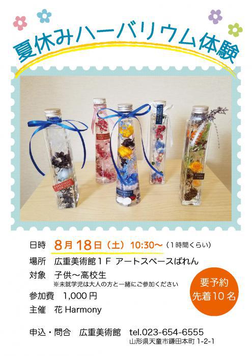 毎日暑い日が続いていますねそんな暑い夏に涼を感じるハーバリウム体験のお知らせです。8月18日(土)10:30〜子供〜高校生を対象に開催します。夏休みの最後の思い出作りにぜひ参加してみませんか?お申し込みは広重美術館(tel.023-654-6555)まで