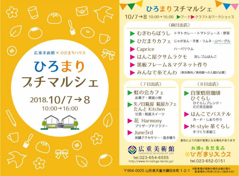 広重美術館×ひだまりハウスのコラボイベント【ひろまりプチマルシェ】。アート、フード、手づくりをテーマに、10月7日(日)8日(月)に開催します。食べて、作って、お買い物して、たのしい2日間です!