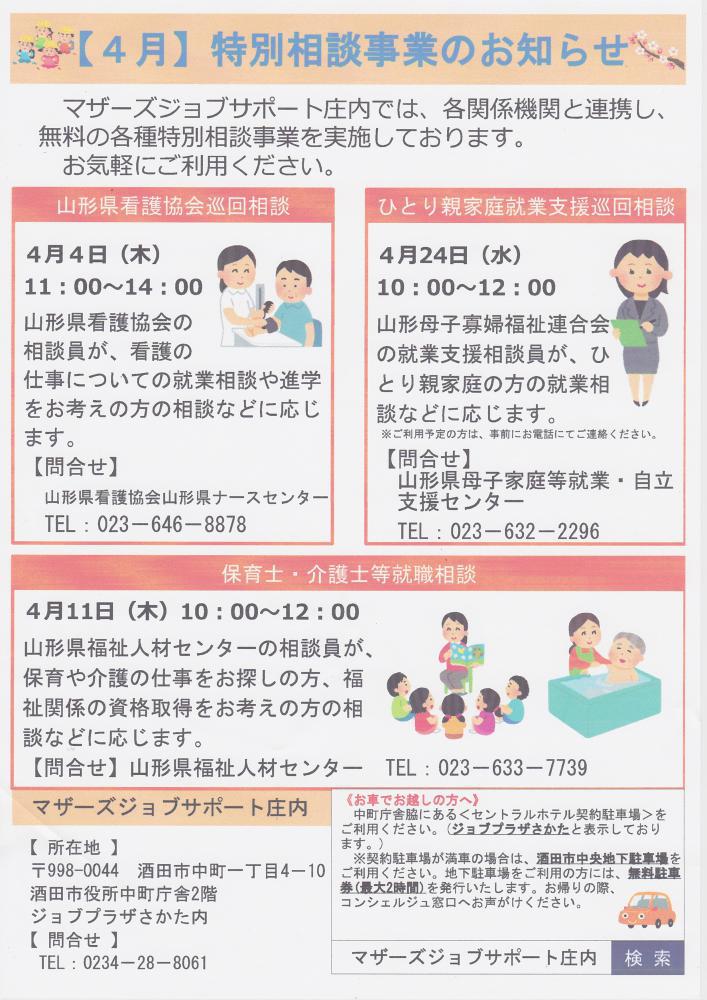 マザーズジョブサポート庄内では、各関係機関と連携し、各種特別相談事業を実施しております。ぜひ、ご利用ください。  山形県看護協会巡回相談 ※お申し込み不要  日時  4月4日(木)11:00〜14:00  場所  マザーズジョブサポート庄内 セミナールーム  問合せ 山形県看護協会 пF023-646-8878       HP:http://www.nurse-yamagata.or.jp/       看護の仕事への復職をお考えの方、お気軽にご相談ください。   保育士・介護士等就職相談 ※お申し込み不要  日時  4月11日(木)10:00〜12:00  場所  マザーズジョブサポート庄内 セミナールーム   問合せ 山形県福祉人材センター пF023-633-7739       HP:http://www.ymgt-shakyo.or.jp/jinzai/      保育士・介護士・看護師など資格をお持ちの方や、      資格取得を目指している方、福祉職にご関心のある方は      お気軽にお越しください。   ひとり親家庭就業支援相談 [要予約]  日時  4月24日(水)10:00〜12:00  場所  マザーズジョブサポート庄内 セミナールーム  問合せ 山形県母子家庭等就業・自立支援センター пF023-632-2296       HP:http://www.y-boshi.com/self-support/       ひとり親家庭の方や今後について考えている方、      どうぞお気軽にお越しください。         ※ご利用希望の方は、マザーズジョブサポート庄内への       ご登録が必要となります。      ※ご相談の際、お子さまの託児は『保育ルームきらきら』を       ご利用いただけます。 事前にご予約が必要です。  ※各相談会について、利用ご希望の方は、 マザーズジョブサポート庄内 マザーズ・コンシェルジュまで お気軽にお声掛けください。※ご相談の際、お子さまの託児は『保育ルーム きらきら』をご利用いただけます。 託児ルームのご利用には、事前のご登録が必要です。  【駐車場について】 お車でお越しの際は、中町庁舎脇にある 〈セントラルホテル契約駐車場〉をご利用ください。 (ジョブプラザさかたと表示してあります。) ※契約駐車場が満車の場合は、 酒田市中央地下駐車場をご利用ください。 地下駐車場をご利用の方は、無料駐車券(最大2時間)を 発行いたします。 お帰りの際に、コンシェルジュ窓口へお声がけください。 ◇お申込み・お問い合わせ◇マザーズジョブサポート庄内TEL:0234-28-8061