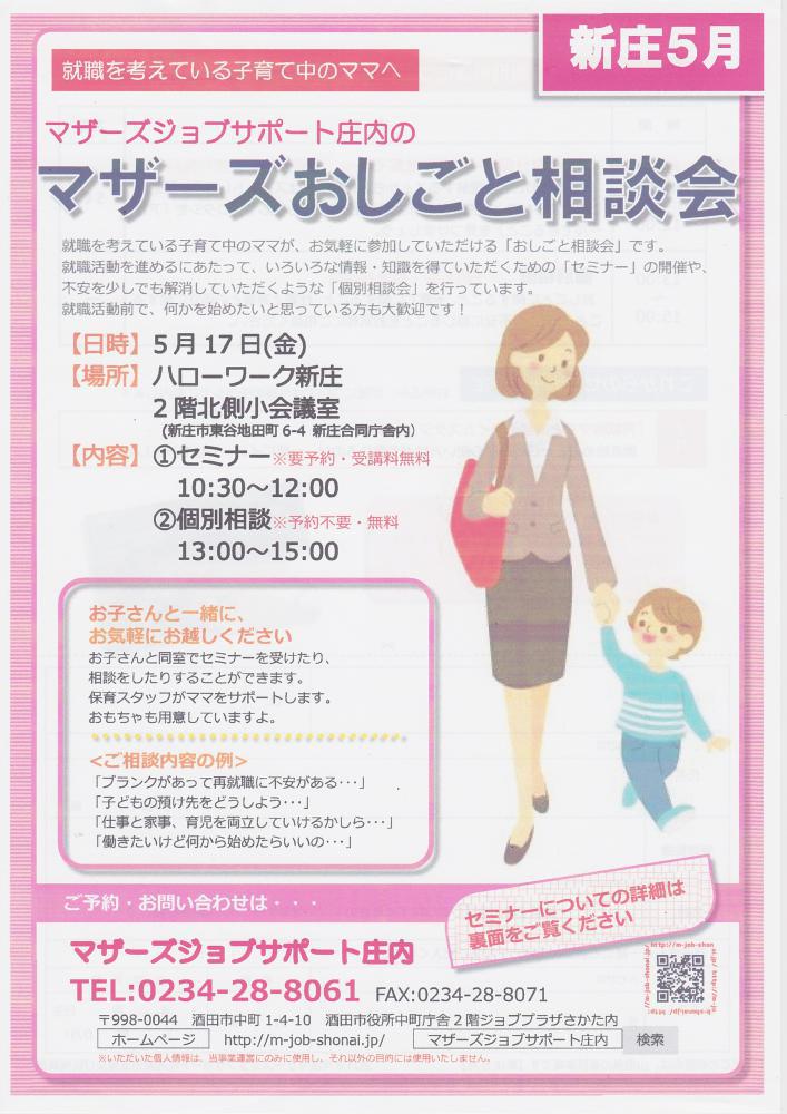 ハローワーク新庄『おしごと相談会』を開催します。 【日時と内容】■ 5月17日(金) 10:30〜12:00 セミナー ※お申込みが必要です。  「ママの自分探し〜ワタシを探そう〜」  自分自身のことを理解することからお仕事探しはスタートします。  得意なこと、苦手なこと、長所と短所など、自分の棚卸しをして、  ワタシを「アピールできること」を見つけましょう。   13:00〜15:00 個別相談会      ・おしごとに関するお悩み        ・子育てに関すること      ・仕事と家事、子育てとの両立     など、お気軽にご相談ください。    ※どなたでもご利用いただけます、お申込みは不要です。    直接『2階 北側小会議室』へお越しください♪    ○見守り託児付きです○       セミナー受講中やご相談中は、       保育スタッフがお子さんを見守ります。     見守り託児付きです。     安心して、お子さん連れでおいでください。        ◇これからのセミナーの予定◇       7月:「再就職ママと家族のタイムスケジュール」         働き始めると一日の時間の使い方はどう変わるのか。         一緒にイメージしてみましょう> ◇お申込み・お問い合わせ◇   マザーズジョブサポート庄内 TEL:0234-28-8061