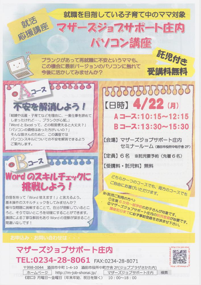 ☆マザーズジョブサポート庄内主催☆再就職応援 『パソコン講座』のお知らせ   ◇Aコース◇    4月22日(月)10:15〜12:15  『不安を解消しよう!』   「結婚や出産・子育てなどを理由に、   一度仕事をやめてしまったけれど…。ブランクが心配。」   「WordとExcelって、どの程度使えると大丈夫?」   「パソコンの資格はあったほうがいいの?」   そんな皆さんのために、この講座では   パソコンスキルについての不安を解消できるようご案内します。        ◇Bコース◇    4月22日(月)13:30〜15:30  『Wordのスキルチェックに挑戦しよう!』         自信を持って「Word使えます!」と言えるよう、   基本操作のスキルチェックをしてみませんか?   様々な問題に挑戦することで、自分が理解しているところと   そうでないところ明確にすることができます。   講師による丁寧な解説もありWordの理解が深まること   間違いなしです!     ♪片方のコースのみ、両方のコース、どちらの受講でも可能です♪ ※本セミナーは「雇用保険受給中の求職活動実績」として認められます。 【対 象】就職を目指している子育て中のママ        ※就職活動前で何かを始めたい方でもOK【会 場】マザーズジョブサポート庄内 セミナールーム【料 金】受講料 及び 託児料 無料【定 員】先着6名 ※お申込みが必要です。【託 児】定員6名 ※事前登録・予約が必要です。                     ※併設の保育ルームで、保育スタッフがお子さんを          お預かりします。ママは安心して受講いただけます。  【駐車場について】お車でお越しの際は、中町庁舎脇にある〈セントラルホテル契約駐車場〉をご利用ください。(ジョブプラザさかたと表示してあります。)※契約駐車場が満車の場合は、酒田市中央地下駐車場をご利用ください。地下駐車場をご利用の方は、無料駐車券(最大2時間)を発行いたします。お帰りの際に、コンシェルジュ窓口へお声がけください。  お気軽にお問い合わせください♪ ◇お申込み・お問い合わせ◇マザーズジョブサポート庄内TEL:0234-28-8061