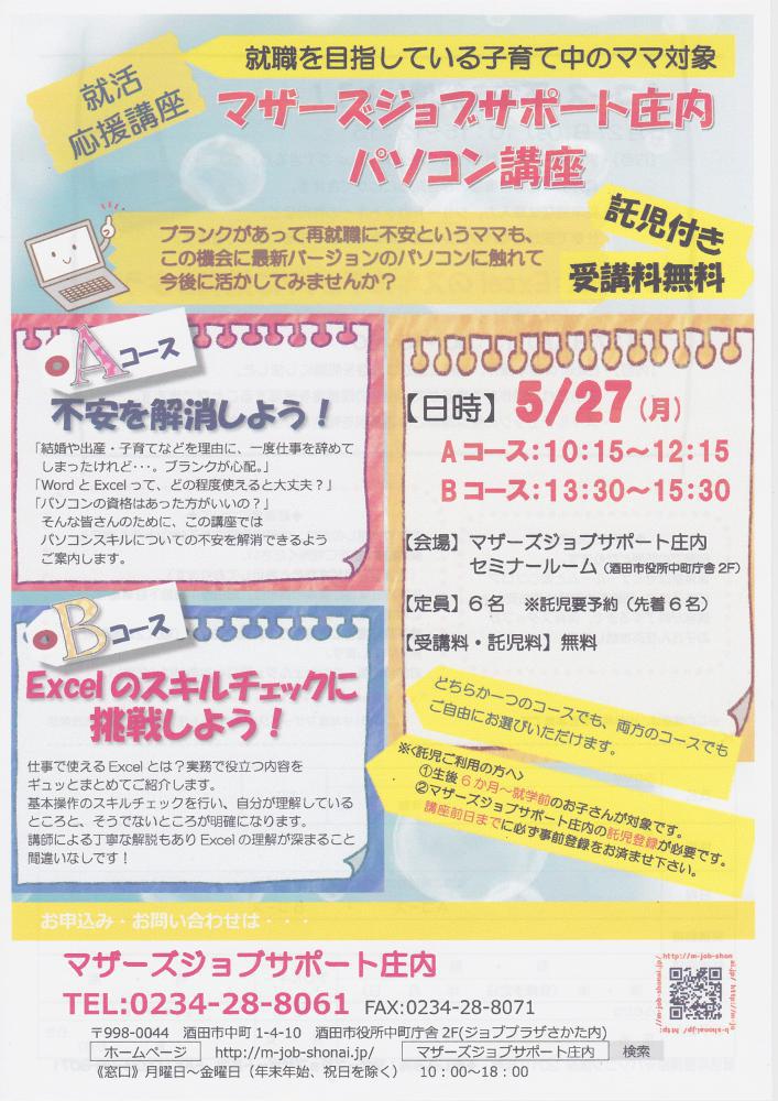 ☆マザーズジョブサポート庄内主催☆再就職応援 『パソコン講座』のお知らせ ◇Aコース◇ 5月27日(月)10:15〜12:15 『不安を解消しよう!』 「結婚や出産・子育てなどを理由に、 一度仕事をやめてしまったけれど…。ブランクが心配。」 「WordとExcelって、どの程度使えると大丈夫?」 「パソコンの資格はあったほうがいいの?」 そんな皆さんのために、この講座では パソコンスキルについての不安を解消できるようご案内します。 ◇Bコース◇ 5月27日(月)13:30〜15:30 『Excelのスキルチェックに挑戦しよう!』 仕事で使えるExcelとは?実務で役立つ内容を ギュッとまとめてご紹介します。 基本操作のスキルチェックを行い、自分が理解しているところと そうでないところが明確になります。 講師による丁寧な解説もありExcelの理解が深まること 間違いなしです! ♪片方のコースのみ、両方のコース、どちらの受講でも可能です♪ ※本セミナーは「雇用保険受給中の求職活動実績」として認められます。 【対 象】就職を目指している子育て中のママ ※就職活動前で何かを始めたい方でもOK【会 場】マザーズジョブサポート庄内 セミナールーム【料 金】受講料 及び 託児料 無料【定 員】先着6名 ※お申込みが必要です。【託 児】定員6名 ※事前登録・予約が必要です。 ※併設の保育ルームで、保育スタッフがお子さんを お預かりします。ママは安心して受講いただけます。 【駐車場について】お車でお越しの際は、中町庁舎脇にある〈セントラルホテル契約駐車場〉をご利用ください。(ジョブプラザさかたと表示してあります。)※契約駐車場が満車の場合は、酒田市中央地下駐車場をご利用ください。地下駐車場をご利用の方は、無料駐車券(最大2時間)を発行いたします。お帰りの際に、コンシェルジュ窓口へお声がけください。 お気軽にお問い合わせください♪ ◇お申込み・お問い合わせ◇マザーズジョブサポート庄内TEL:0234-28-8061