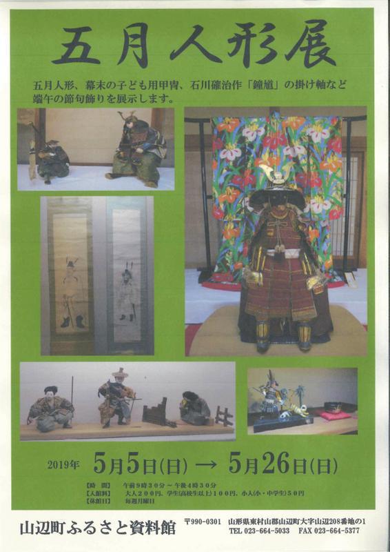 ふるさと資料館にて『五月人形展』を開催しています。五月人形は、男子の誕生を祝うとともに、健やかな成長を願い飾られます。ふるさと資料館では、歴史ある鎧や兜、勇ましい人形の数々を多数展示しています。この機会にぜひ、ふるさと資料館に足を運んでみてはいかがでしょうか! ふるさと資料館『五月人形展』□開催期間    2019年5月5日(日)〜5月26日(日)             ※月曜日は休館日□開催時間    午前9時30分〜午後4時30分□入 館 料     大人200円/学生100円/子供50円□お問合せ先  山辺町ふるさと資料館 [TEL]023−664−5033