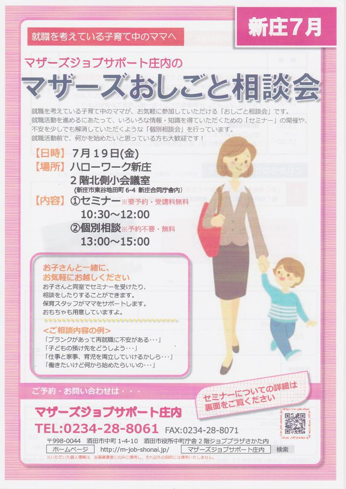 ハローワーク新庄『おしごと相談会』を開催します。 【日時と内容】■ 7月19日(金) 10:30〜12:00 セミナー ※お申込みが必要です。  「再就職ママと家族のタイムスケジュール」   自分や家族の一日をタイムスケジュール表にあらわして、   生活を見直してみましょう。働き始めると、今の生活が   どんなふうに変わっていくのかイメージしましょう。   仕事復帰のヒントを一緒に考えてみませんか?   13:00〜15:00 個別相談会        ・おしごとに関するお悩み    ・子育てに関すること    ・仕事と家事、子育てとの両立     など、お気軽にご相談ください。    ※どなたでもご利用いただけます、お申込みは不要です。    直接『2階 北側小会議室』へお越しください♪ ○見守り託児付きです○       セミナー受講中やご相談中は、       保育スタッフがお子さんを見守ります。     見守り託児付きです。     安心して、お子さん連れでおいでください。        ◇これからのセミナーの予定◇       9月:「働く準備をしよう!〜知っておきたい就職活動の基本〜」         働く目的を一緒に整理し、就職活動についての基本を      学んでいきます。 ◇お申込み・お問い合わせ◇  マザーズジョブサポート庄内 TEL:0234-28-8061