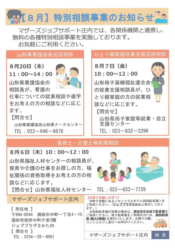 マザーズジョブサポート庄内では、各関係機関と連携し、各種特別相談事業を実施しております。ぜひ、ご利用ください。  山形県看護協会巡回相談 ※お申し込み不要日 時  8月20日(木)11:00〜14:00場 所  マザーズジョブサポート庄内 セミナールーム問合せ  山形県看護協会 пF023-646-8878HP:http://www.nurse-yamagata.or.jp/ 看護の仕事への復職をお考えの方、お気軽にご相談ください。    保育士・介護士等就職相談 ※お申し込み不要日 時  8月6日(木)10:00〜12:00場 所  マザーズジョブサポート庄内 セミナールーム問合せ  山形県福祉人材センター      пF023-633-7739HP:http://www.ymgt-shakyo.or.jp/jinzai/保育士・介護士・看護師など資格をお持ちの方や、資格取得を目指している方、福祉職にご関心のある方は、お気軽にお越しください。  ひとり親家庭就業支援相談 [要予約]日 時 8月7日(金)10:00〜12:00場 所 マザーズジョブサポート庄内 セミナールーム問合せ 山形県母子家庭等就業・自立支援センター     пF023-632-2296HP:http://www.y-boshi.com/self-support/ひとり親家庭の方や今後について考えている方、どうぞお気軽にお越しください。  ※各相談会について、利用ご希望の方は、マザーズジョブサポート庄内までお気軽にお声掛けください。※ご相談の際、お子さまの託児は『保育ルーム きらきら』をご利用いただけます。託児ルームのご利用には、事前のご登録が必要です。  【駐車場について】お車でお越しの際は、中町庁舎脇にある〈セントラルホテル契約駐車場〉をご利用ください。(ジョブプラザさかたと表示してあります。)※契約駐車場が満車の場合は、酒田市中央地下駐車場をご利用ください。無料駐車券(最大2時間)を発行いたします。お帰りの際に、コンシェルジュ窓口へお声がけください。 ◇お申込み・お問い合わせ◇マザーズジョブサポート庄内TEL:0234-28-8061