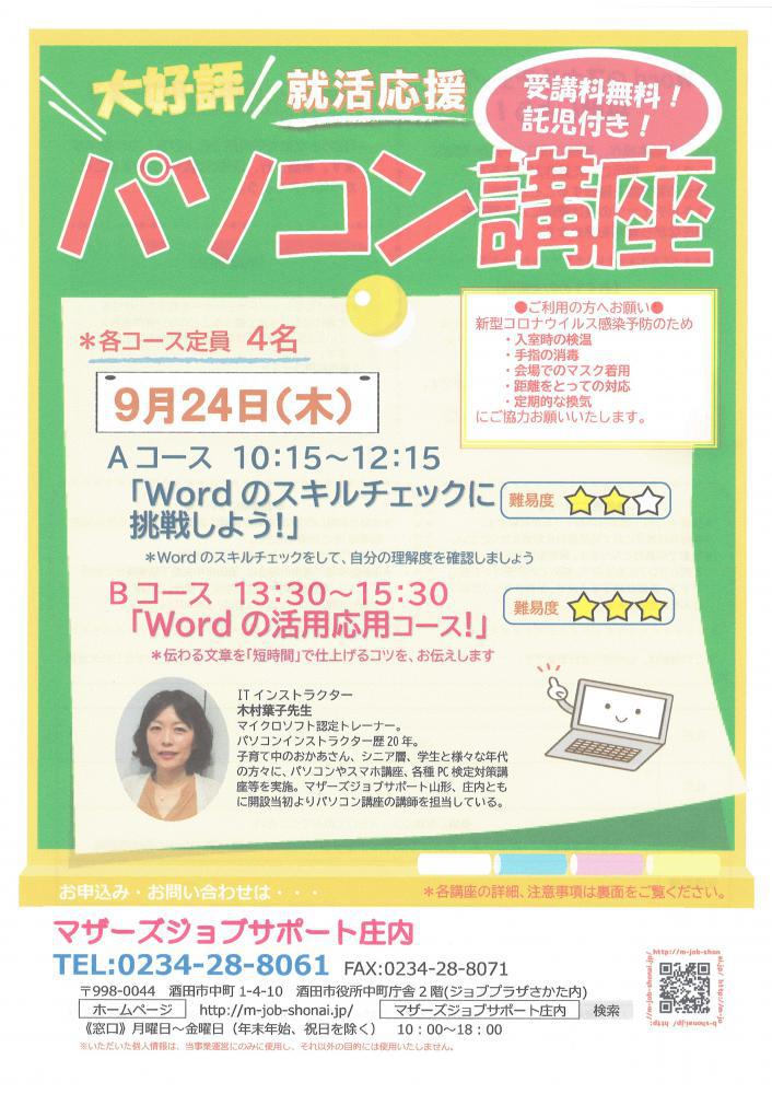 ☆マザーズジョブサポート庄内主催☆再就職応援『パソコン講座』のお知らせ ◇9月◇≪Aコース≫ 9月24日(木)10:15〜12:15『Wordのスキルチェックに挑戦しよう!』難易度:★★Wordの基本操作、実務で役立つ内容を問題にして指示された操作ができるかチェックします。解説を聞きながら操作をして理解を深めましょう! ≪Bコース≫ 9月24日(木)13:30〜15:30『Wordの活用応用コース!』難易度:★★★「伝わる文章を短時間で仕上げる」コツを学びます。単語、行、段落の違いを理解することからはじめましょう!! ♪片方のコースのみ、両方のコース、どちらの受講でも可能です♪※本セミナーは「雇用保険受給中の求職活動実績」として認められます。 ★★受講者の皆様へお願い★★新型コロナウイルス拡大防止のため、・入室時の検温・手指の消毒・会場でのマスク着用・距離をとっての対応・定期的な換気にご協力お願いいたします。★★ーーーーーーーーーーーー★★【対 象】就職を目指している子育て中のママ※就職活動前で何かを始めたい方でもOK【会 場】マザーズジョブサポート庄内 セミナールーム【料 金】受講料 及び 託児料 無料【定 員】先着4名 ※お申込みが必要です。【託 児】定員4名 ※事前登録・予約が必要です。 【駐車場について】お車でお越しの際は、中町庁舎脇にある〈セントラルホテル契約駐車場〉をご利用ください。(ジョブプラザさかたと表示してあります。)※契約駐車場が満車の場合は、酒田市中央地下駐車場をご利用ください。無料駐車券(最大2時間)を発行いたします。お帰りの際に、コンシェルジュ窓口へお声がけください。 ◇お申込み・お問い合わせ◇マザーズジョブサポート庄内TEL:0234-28-8061