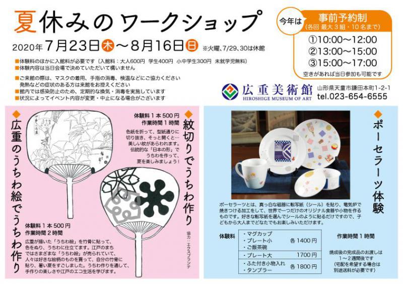 \\夏休みのワークショップ//コロナ対策をして今年も開催します。会期◆2020年7月23日(木)〜8月16日(日)... ※火曜日と7/29、30は休館時間◆@10:00〜12:00 A13:00〜15:00 B15:00〜17:00 今年は事前予約制(各回 最大3組・10名まで) 空きがあれば当日参加も可能です〈体験メニュー〉【広重のうちわ絵でうちわ作り】 体験料1本500円/作業時間2時間 広重が描いた「うちわ絵」を竹骨に貼って、色をぬり、うちわに仕立てます。江戸のまちではさまざまな「うちわ絵」が売られていて、人々は好きな絵柄のものを買って、自分の竹骨に貼り、暑い夏をすごしました。うちわ作りを通して、手作りの楽しさや江戸のエコ生活を学びます。【紋切りでうちわ作り】 体験料1本500円/作業時間1時間 色紙を折って、型紙通りに切り抜き、そっと開くと…美しい紋があらわれます。伝統的な「日本の形」でうちわを作って、夏を楽しみましょう!【ポーセラーツ体験】 体験料 マグカップ・プレート他 1400〜1800円/作業時間1時間 ポーセラーツとは、真っ白な磁器に転写紙(シール)を貼り、電気炉で焼きつける加工をして、世界で一つだけのオリジナル食器や小物を作るものです。好きな転写紙を選んでシールのように貼るだけですので、子どもから大人までどなたでもお楽しみいただけます。※焼成後の完成品のお渡しは1〜2週間後です。(宅配を希望する場合は別途送料が必要です)■体験料のほかに入館料が必要です。(入館料:大人600円 学生400円 小中学生300円 未就学児無料)■体験内容は当日会場で決めていただいて構いません。■ご来館の際は、マスクの着用、手指の消毒、検温などにご協力ください。発熱などの症状のある方は来館をお控えください。■館内では感染防止のため、定期的な換気・消毒を実施しています。■状況によってイベント内容が変更・中止になる場合がございます。申込み◆広重美術館(tel.023-654-6555)