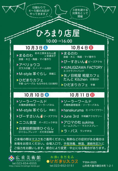 広重美術館とひだまりハウスでは、これまで春と秋に「ひろまりプチマルシェ」を開催してきましたが、新型コロナウイルスの影響で2020年春は中止せざるを得ませんでした。そこでこの秋は、3密を避ける対策をとって「ひろまり店屋」を開催します。開催日は4日間、日替わりで4〜5組のお店がやってきます。規模は縮小となりますが、楽しい時間をお過ごしいただけましたら幸いです。日時/2020年 10月3日(土)・4日(日)・10日(土)・11日(日) 10:00−16:00場所/広重美術館前駐車場・アートスペースばれん 【ご来場の皆様へのお願い】・会場内ではマスクをご着用ください。・発熱などの症状がある場合は来場をお控えください。・会場入口で、手指消毒、検温、連絡先記入にご協力をお願いします。・飲食スペースは屋外とします。・新型コロナウイルスの状況によっては変更・中止になる場合があります。 広重美術館 tel.023-654-6555ひだまりハウス tel.023-652-0151〒994-0025 山形県天童市鎌田本町1-2-1