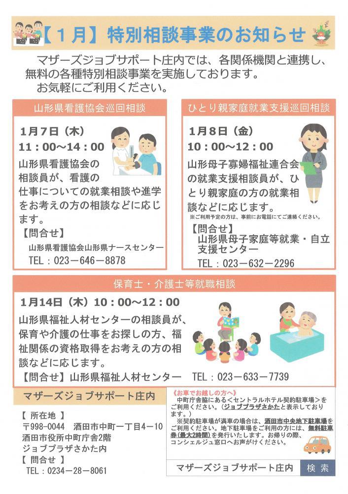マザーズジョブサポート庄内では、各関係機関と連携し、各種特別相談事業を実施しております。ぜひ、ご利用ください。 山形県看護協会巡回相談 ※お申し込み不要日 時 1月7日(木)11:00〜14:00場 所 マザーズジョブサポート庄内 セミナールーム問合せ 山形県看護協会 пF023-646-8878HP:http://www.nurse-yamagata.or.jp/ 看護の仕事への復職をお考えの方、お気軽にご相談ください。 保育士・介護士等就職相談※お申し込み不要日 時 1月14日(水)10:00〜12:00場 所 マザーズジョブサポート庄内 セミナールーム問合せ 山形県福祉人材センター пF023-633-7739HP:http://www.ymgt-shakyo.or.jp/jinzai/保育士・介護士・看護師など資格をお持ちの方や、資格取得を目指している方、福祉職にご関心のある方は、お気軽にお越しください。 ひとり親家庭就業支援相談 [要予約]※予定していた1/8は中止となりました。問合せ 山形県母子家庭等就業・自立支援センター пF023-632-2296HP:http://www.y-boshi.com/self-support/ ※各相談会について、利用ご希望の方は、マザーズジョブサポート庄内までお気軽にお声掛けください。※ご相談の際、お子さまの託児は『保育ルーム きらきら』をご利用いただけます。託児ルームのご利用には、事前のご登録が必要です。 【駐車場について】お車でお越しの際は、中町庁舎脇にある〈セントラルホテル契約駐車場〉をご利用ください。(ジョブプラザさかたと表示してあります。)※契約駐車場が満車の場合は、酒田市中央地下駐車場をご利用ください。無料駐車券(最大2時間)を発行いたします。お帰りの際に、コンシェルジュ窓口へお声がけください。 ◇お申込み・お問い合わせ◇マザーズジョブサポート庄内TEL:0234-28-8061