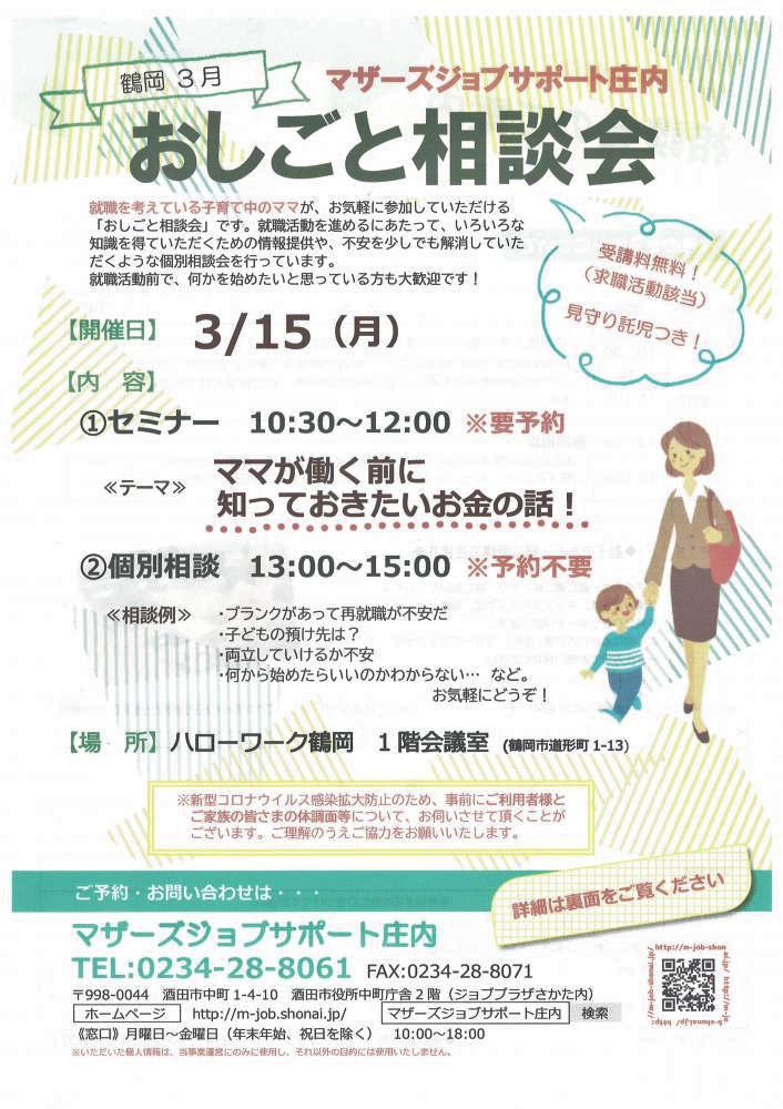 マザーズジョブサポート庄内『おしごと相談会』を開催します。 【日時と内容】■ 3月15日(月)10:30〜12:00 セミナー ※お申込みが必要です。「ママが働く前に知っておきたいお金の話!」社会保険のことや、年金のこと、「扶養の範囲内で働くということなどママが今後の働き方を考える上で大切な内容を、社会保険労務士がお話します。13:00〜15:00 個別相談会※お申込みは不要です。・おしごとに関するお悩み・子育てに関すること・仕事と家事、子育てとの両立      など、お気軽にご相談ください。 ♪お子さんと一緒に、お気軽にお越しください♪お子さんと同じお部屋でセミナーを受講し、相談することができます。保育スタッフが、お子さんを見守ります。 ★★受講者の皆様へお願い★★新型コロナウイルス拡大防止のため、・入室時の検温・手指の消毒・会場でのマスク着用・距離をとっての対応・定期的な換気にご協力お願いいたします。★★ーーーーーーーーーーーー★★  ◇お申込み・お問合せ◇マザーズジョブサポート庄内TEL:0234-28-8061