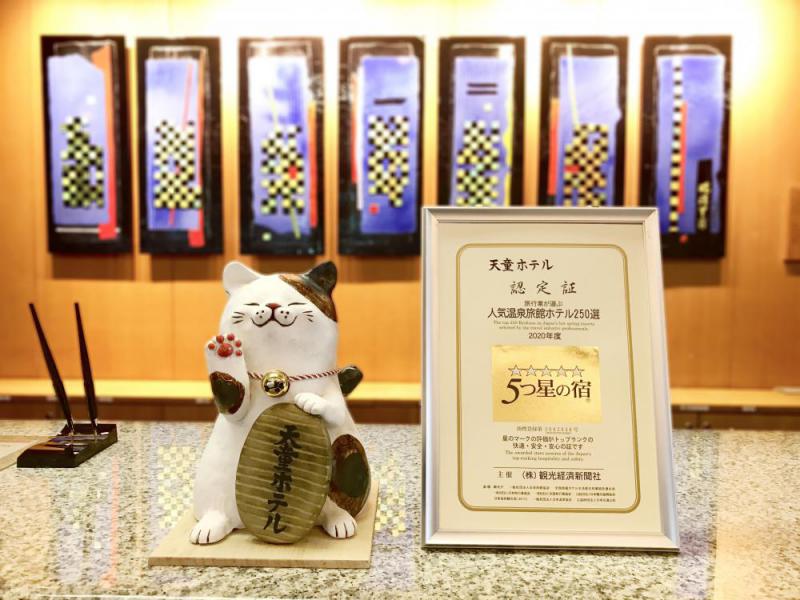 今年(2020年度)も、観光経済新聞社主催「人気温泉旅館ホテル250選」に選ばれ認定証を頂きました。加えて、通算5回以上の入選で認定される「5つ星の宿」にも引き続き認定されました。日頃よりたくさんのご愛顧を頂き誠にありがとうございます!現在は休館せざるを得ない日もありお客様にはご迷惑をおかけしておりますが、これからもあたたかいおもてなしを追求して参りますので、どうぞ今後ともよろしくお願いいたします。「笑う門には福来る」、スタッフ一同笑顔でお待ちしております!美味求真の宿 天童ホテルhttps://www.tendohotel.co.jp