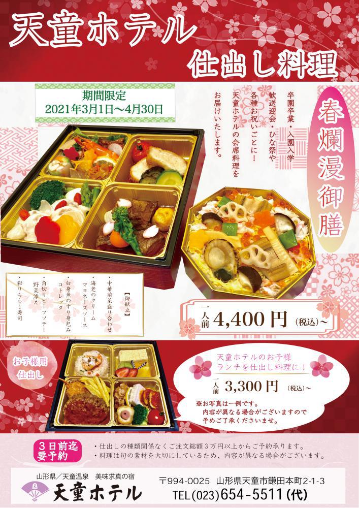 この度春期間限定の仕出し料理、『春爛漫御膳』が誕生いたしました♪『春爛漫御膳』は卒園卒業、入園入学、歓送迎会はもちろん、ひな祭や各種お祝いごとにご利用いただけます!2021年3月1日〜4月30日の期間限定仕出し、ご予約受付中です!また、天童ホテルのお子様ランチを仕出し料理にした『お子様用仕出し』も販売することとなりました。特別な日のお食事に、ご家族皆様でぜひ天童ホテルのお料理をご堪能いただけましたら幸いです!▼春の仕出し春爛漫御膳 【期間限定】▼■1人前4,400(税込)〜・中華前菜盛り合わせ・海老のクリームマヨネーズソース・白身魚のすり身包みコトレッタ・角切りビーフソテー 野菜添え・彩りちらし寿司※2021年3月1日〜4月30日の期間限定になります。▼仕出し料理各種 【通年販売中】▼■1人前8,800円(税込)〜・中国前菜盛り合わせ・旬の煮魚・有頭海老チリソース・蟹爪フリッター黒酢ソース・庄内豚のピザイオラ風・蔵王牛サーロインのグリエ 野菜添え・穴子ちらし寿司・デザートとフルーツ■1人前5,500円(税込)〜・中国前菜盛り合わせ・鳳凰海老チリソース・蟹爪マヨネーズ・白身魚のすり身包みコトレッタ・牛フィレのグリエ 野菜添え・鮭といくらのちらし寿司■1人前3,300円(税込)〜・中国前菜盛り合わせ・海老チリソース・蟹爪マヨネーズ・角切りビーフソテー 野菜添え・鮭といくらのちらし寿司■お子様用仕出し 1人前3,300円(税込)〜※掲載写真の御献立と異なる場合がございます。 ?3日前までにご予約ください。?配達は仕出しの種類関係なくご注文総額30,000円以上から承ります。※来館してのお持ち帰りの場合は金額ご相談ください?御献立は仕入れ状況により変わる場合があります美味求真の宿 天童ホテルTEL 023-654-5511(電話受付8:00〜17:00)https://www.tendohotel.co.jp