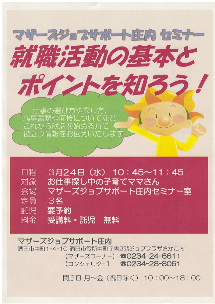 『マザーズジョブサポート庄内求職支援セミナー』『就職活動の基本とポイントを知ろう!』を行います! 就職活動を始めるための基本とポイントを学んでみませんか?★仕事の選び方や探し方★応募書類や面接について など 就活を進めるママに役立つ情報をお伝えします。 ハローワークマザーズコーナーでは定期的にセミナーを開催します。奮ってご参加下さい。受講後も疑問点など、窓口にてご相談が受けられます。☆雇用保険受給者の方は求職活動実績にカウント出来ます☆ 【日 時】3月24日(水)10時45分〜11時45分【対 象】お仕事探し中の子育てママさん【会 場】マザーズジョブサポート庄内セミナールーム【料 金】受講料 及び 託児料 無料【定 員】先着3名※お申込みが必要です。【託 児】定員3名※事前登録・予約が必要です。※併設の保育ルームで、保育スタッフがお子さんをお預かりします。ママは安心して受講いただけます。 【駐車場について】お車でお越しの際は、中町庁舎脇にある〈セントラルホテル契約駐車場〉をご利用ください。(ジョブプラザさかたと表示してあります。)※契約駐車場が満車の場合は、酒田市中央地下駐車場をご利用ください。無料駐車券(最大2時間)を発行いたします。お帰りの際に、マザーズ窓口へお声がけください。 どうぞ、お気軽にお問合せくださいね。 ◇お申込み・お問い合わせ◇マザーズジョブサポート庄内<ハローワークマザーズコーナー>TEL:0234-24-6611<コンシェルジュコーナー>TEL:0234-28-8061