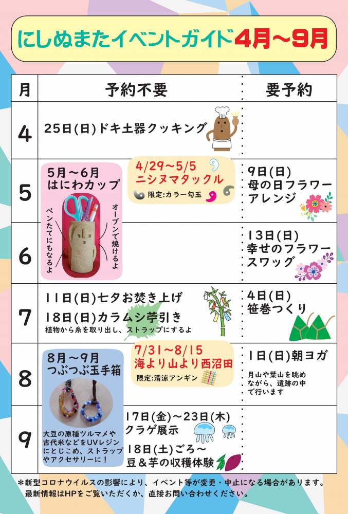 今年度のイベントスケジュールを公開しました。各イベントの詳しい内容や参加者募集については、順次ご案内していきます。新型コロナウイルスの影響により、イベント等が変更・中止になる場合があります。ホームページ上で最新情報をご確認いただくか、直接お問い合わせください。
