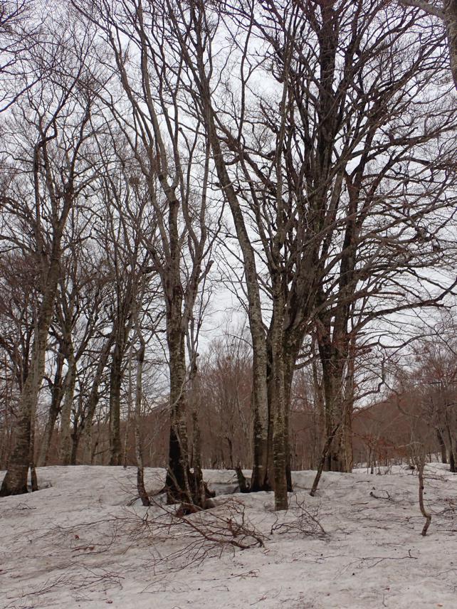 残雪上から木々も低く感じられ枝先に付く混芽を観察しながら季節感を味わう。