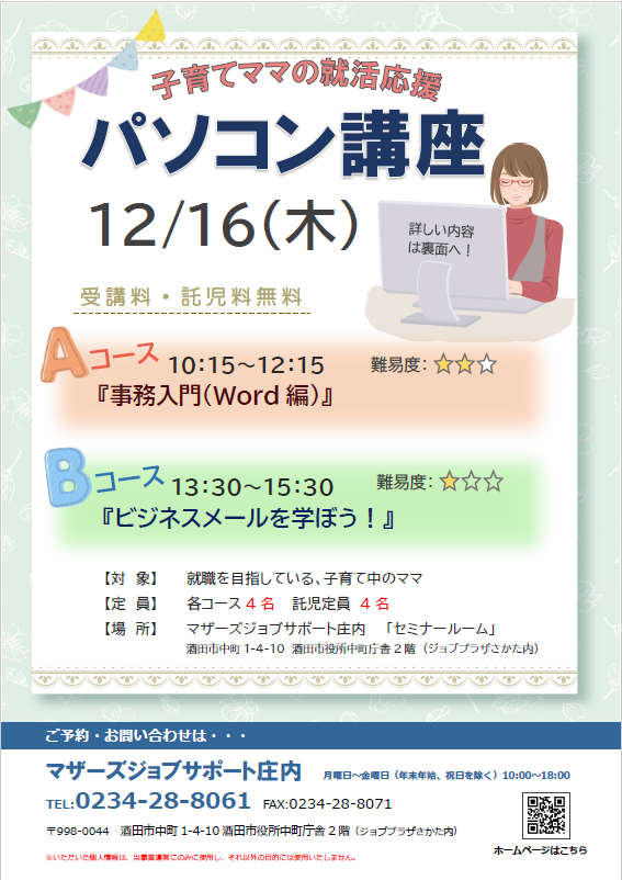 ☆マザーズジョブサポート庄内主催☆再就職応援『パソコン講座』のお知らせ ◇12月◇≪Aコース≫  12月16日(木)10:15〜12:15『事務入門(Word編)』事務のお仕事にも、一般・経理・労務など様々です。それぞれどのようなパソコン作業があるのかを確認していきます。実際にWordを使って、ビジネス文書を作成し、印刷まで行います。  ≪Bコース≫  12月16日(木)13:30〜15:30『ビジネスメールを学ぼう!』ビジネスメールの基本やマナーを、実際に操作しながら学ぶことができます。仕事がスムーズに進むメールの書き方など、ビジネス上の様々なシーンで役立つ内容をお伝えします。 ♪片方のコースのみ、両方のコース、どちらの受講でも可能です♪※本セミナーは「雇用保険受給中の求職活動実績」として認められます。  ★★受講者の皆様へお願い★★新型コロナウイルス拡大防止のため、・入室時の検温・手指の消毒・会場でのマスク着用・距離をとっての対応・定期的な換気にご協力お願いいたします。新型コロナウイルス感染症の影響により中止または延期となる場合がございます。あらかじめ、ご了承ください。★★ーーーーーーーーーーーー★★【対 象】就職を目指している子育て中のママ※就職活動前で何かを始めたいママもOK【会 場】マザーズジョブサポート庄内 セミナールーム【料 金】受講料 及び 託児料 無料【定 員】先着4名 ※お申込みが必要です。【託 児】定員4名 ※事前登録・予約が必要です。  託児開室日水・木・金16時まで 登録にお越しください。  【駐車場について】お車でお越しの際は、中町庁舎脇にある〈セントラルホテル契約駐車場〉をご利用ください。(ジョブプラザさかたと表示してあります。)※契約駐車場が満車の場合は、酒田市中央地下駐車場をご利用ください。無料駐車券(最大2時間)を発行いたします。お帰りの際に、コンシェルジュ窓口へお声がけください。 ◇お申込み・お問い合わせ◇マザーズジョブサポート庄内TEL:0234-28-8061メールでのお申込みはコチラ