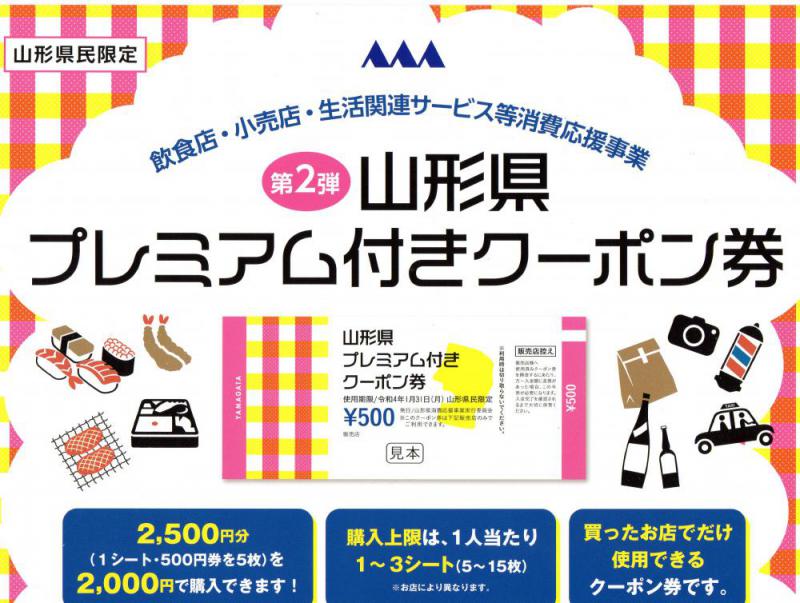 第二弾 山形県プレミアム付きクーポン券の追加販売を本日 11月25日から 当店で販売します ご利用下さい一人3シート購入で30数名で完売です ご了承下さいご購入希望の方は早めにご来店ください*購入した券は当店のみでの利用となります