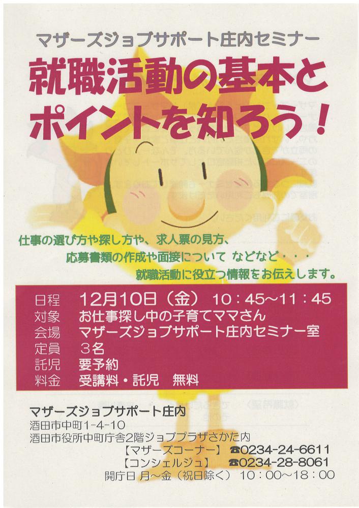 『マザーズジョブサポート庄内求職支援セミナー』『就職活動の基本とポイントを知ろう!』を行います! 就職活動を始めるための基本とポイントを学んでみませんか?★仕事の選び方や探し方★応募書類や面接について など 就活を進めるママに役立つ情報をお伝えします。 ハローワークマザーズコーナーでは定期的にセミナーを開催します。奮ってご参加下さい。受講後も疑問点など、窓口にてご相談が受けられます。☆雇用保険受給者の方は求職活動実績にカウント出来ます☆ 【日 時】12月10日(金)10時45分〜11時45分【対 象】お仕事探し中の子育てママさん【会 場】マザーズジョブサポート庄内セミナールーム【料 金】受講料 及び 託児料 無料【定 員】先着3名※お申込みが必要です。【託 児】定員3名※事前登録・予約が必要です。※併設の保育ルームで、保育スタッフがお子さんをお預かりします。ママは安心して受講いただけます。 【駐車場について】お車でお越しの際は、中町庁舎脇にある〈セントラルホテル契約駐車場〉をご利用ください。(ジョブプラザさかたと表示してあります。)※契約駐車場が満車の場合は、酒田市中央地下駐車場をご利用ください。無料駐車券(最大2時間)を発行いたします。お帰りの際に、マザーズ窓口へお声がけください。 どうぞ、お気軽にお問合せくださいね。 ◇お申込み・お問い合わせ◇マザーズジョブサポート庄内<ハローワークマザーズコーナー>TEL:0234-24-6611<コンシェルジュコーナー>TEL:0234-28-8061