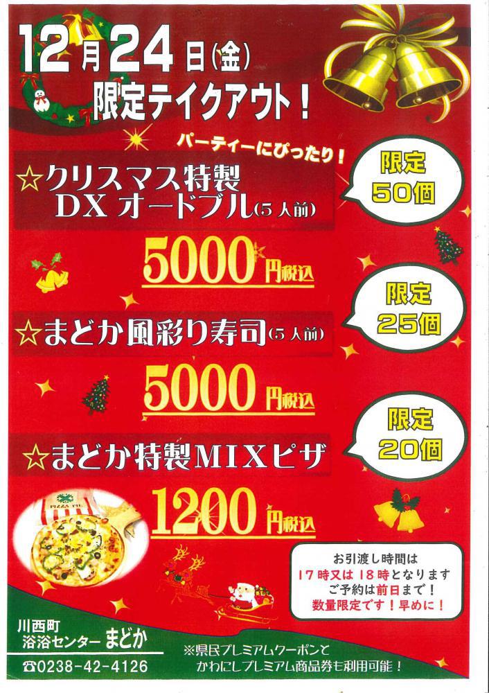 12月24日(金)クリスマス限定のテイクアウトメニューを紹介いたします。●クリスマス特製DXオードブル(5人前)・・・5,000円税込:限定50個●まどか風彩り寿司(5人前)・・・5,000円税込み:限定25個●まどか特製DXピザ・・・1200円税込:20個※お引渡し時間は17時又は18時となります。ご予約は前日まで!!数量限定です。ご予約はお早めに♪※県民プレミアムクーポン・かわにしプレミアム商品券も利用可能川西町浴浴センター まどか TEL0238-42-4126