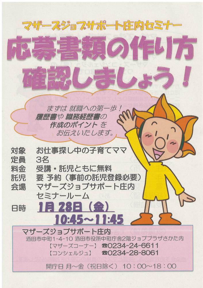 1月 マザーズジョブサポート庄内 求職支援セミナー『応募書類の作り方 確認しましょう!』 を行います! このセミナーは就職への第一歩! 履歴書・職務経歴書のポイント をお伝えします。 ハローワークマザーズコーナーでは 定期的にセミナーを開催します。 奮ってご参加下さい。 受講後も疑問点など、 窓口にてご相談が受けられます。☆雇用保険受給者の方は 求職活動実績にカウント出来ます☆ 【日 時】 1月28日(金) 10時45分〜11時45分【対 象】 お仕事探し中の子育てママさん【会 場】 マザーズジョブサポート庄内 セミナールーム【料 金】 受講料 及び 託児料 無料【定 員】先着3名 ※お申込みが必要です。【託 児】定員3名 ※事前登録・予約が必要です。 ※併設の保育ルームで、保育スタッフが お子さんをお預かりします。 ママは安心して受講いただけます。 【駐車場について】 お車でお越しの際は、中町庁舎脇にあるセントラルホテル契約駐車場をご利用ください。(ジョブプラザさかたと表示してあります。) ※契約駐車場が満車の場合は、 酒田市中央地下駐車場をご利用ください。 ご利用の方は、無料駐車券を(最大2時間) を発行いたします。 お帰りの際に、マザーズ窓口へお声がけください。 どうぞ、お気軽にお問い合わせくださいね。 ◇お申込み・お問い合わせ◇ マザーズジョブサポート庄内 TEL:0234-24-6611(ハローワークマザーズコーナー) TEL:0234-28-8061(コンシェルジュコーナー)
