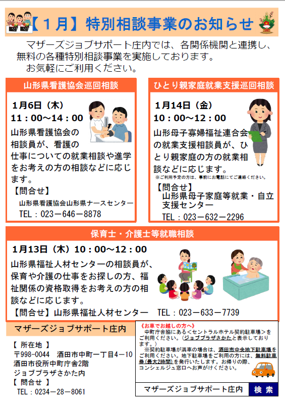 マザーズジョブサポート庄内では、各関係機関と連携し、各種特別相談事業を実施しております。ぜひ、ご利用ください。 山形県看護協会巡回相談 ※お申し込み不要日 時 1月6日(木)11:00〜14:00場 所 マザーズジョブサポート庄内 セミナールーム問合せ 山形県看護協会 пF023-646-8878HP:http://www.nurse-yamagata.or.jp/ 看護の仕事への復職をお考えの方、お気軽にご相談ください。 保育士・介護士等就職相談 ※お申し込み不要日 時 1月13日(木)10:00〜12:00場 所 マザーズジョブサポート庄内 セミナールーム問合せ 山形県福祉人材センター пF023-633-7739HP:http://www.ymgt-shakyo.or.jp/jinzai/保育士・介護士・看護師など資格をお持ちの方や、資格取得を目指している方、福祉職にご関心のある方は、お気軽にお越しください。 ひとり親家庭就業支援相談 [要予約]日 時 1月14日(金)10:00〜12:00場 所 お電話・Zoomを使用しオンラインでの相談問合せ 山形県母子家庭等就業・自立支援センター пF023-632-2296HP:http://www.y-boshi.com/self-support/ひとり親家庭の方や今後について考えている方、どうぞお気軽にご相談ください。※新型コロナウイルス感染拡大防止のため、 しばらくの間お電話やZoomを利用し オンラインでのご相談となります。 ※各相談会について、利用ご希望の方は、マザーズジョブサポート庄内までお気軽にお声掛けください。※ご相談の際、お子さまの託児は『保育ルーム きらきら』をご利用いただけます。託児ルームのご利用には、事前のご登録が必要です。 【駐車場について】お車でお越しの際は、中町庁舎脇にあるセントラルホテル契約駐車場をご利用ください。(ジョブプラザさかたと表示してあります。)※契約駐車場が満車の場合は、酒田市中央地下駐車場をご利用ください。無料駐車券(最大2時間)を発行いたします。お帰りの際に、コンシェルジュ窓口へお声がけください。 ◇お申込み・お問い合わせ◇マザーズジョブサポート庄内TEL:0234-28-8061