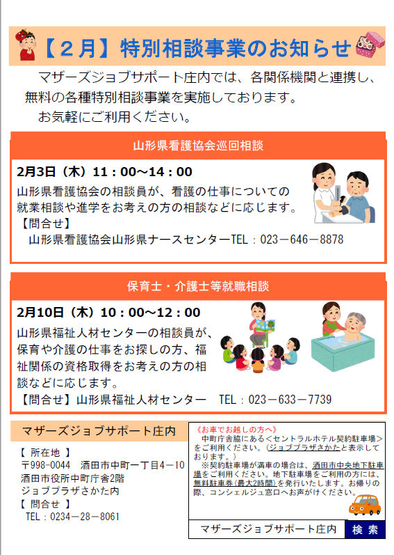 マザーズジョブサポート庄内では、各関係機関と連携し、各種特別相談事業を実施しております。ぜひ、ご利用ください。 山形県看護協会巡回相談 ※お申し込み不要日 時 2月3日(木)11:00〜14:00場 所 マザーズジョブサポート庄内 セミナールーム問合せ 山形県看護協会 пF023-646-8878HP:http://www.nurse-yamagata.or.jp/ 看護の仕事への復職をお考えの方、お気軽にご相談ください。※新型コロナウイルスまん延防止措置期間中のため中止となりました。 保育士・介護士等就職相談 ※お申し込み不要日 時 2月10日(木)10:00〜12:00場 所 マザーズジョブサポート庄内 セミナールーム問合せ 山形県福祉人材センター пF023-633-7739HP:http://www.ymgt-shakyo.or.jp/jinzai/保育士・介護士・看護師など資格をお持ちの方や、資格取得を目指している方、福祉職にご関心のある方は、お気軽にお越しください。※新型コロナウイルスまん延防止措置期間中のため中止となりました。 ※各相談会について、利用ご希望の方は、マザーズジョブサポート庄内までお気軽にお声掛けください。※ご相談の際、お子さまの託児は『保育ルーム きらきら』をご利用いただけます。託児ルームのご利用には、事前のご登録が必要です。 【駐車場について】お車でお越しの際は、中町庁舎脇にあるセントラルホテル契約駐車場をご利用ください。(ジョブプラザさかたと表示してあります。)※契約駐車場が満車の場合は、酒田市中央地下駐車場をご利用ください。無料駐車券(最大2時間)を発行いたします。お帰りの際に、コンシェルジュ窓口へお声がけください。 ◇お申込み・お問い合わせ◇マザーズジョブサポート庄内TEL:0234-28-8061