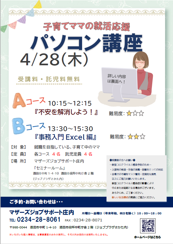 ☆マザーズジョブサポート庄内主催☆ 就活応援『パソコン講座』のお知らせ ≪Aコース≫ 4月28日(木)10:15〜12:15『不安を解消しよう!』難易度:★「求人票の"パソコンが使える方"ってどの程度?」「仕事では、どのくらいのスキルが求められるの?」「WordとExcelって、どの程度使えると大丈夫?」などいろいろな不安がありますよね… パソコンについての"これから"を考えるきっかけに♪ ≪Bコース≫ 4月28日(木)13:30〜15:30『事務入門(Excel編)』難易度:★★事務のお仕事にも、一般・経理・労務など様々です。それぞれどのようなパソコン作業があるのかを確認していきます。実際にエクセルで、関数を利用し請求書を作成します。 ♪片方のコースのみ、両方のコース、どちらの受講でも可能です♪※本セミナーは「雇用保険受給中の求職活動実績」として認められます。 【対 象】就職を目指している子育て中のママ※就職活動前で何かを始めたいママもOK【会 場】マザーズジョブサポート庄内 セミナールーム【料 金】受講料 及び 託児料 無料【定 員】先着4名 ※お申込みが必要です。【託 児】定員4名 ※事前登録・予約が必要です。保育ルーム開室日【水・木・金】の 10:00〜16:00に登録にお越し下さい。 ※併設の保育ルームで、保育スタッフが お子さんをお預かりします。 ママは安心して受講いただけます。 【駐車場について】お車でお越しの際は、中町庁舎脇にあるセントラルホテル契約駐車場をご利用ください。(ジョブプラザさかたと表示してあります。)※契約駐車場が満車の場合は、酒田市中央地下駐車場をご利用ください。無料駐車券(最大2時間)を発行いたします。お帰りの際に、コンシェルジュ窓口へお声がけください。 ★★受講者の皆様へお願い★★〜新型コロナウイルス感染予防のため〜・入室時の検温・手指の消毒・距離をとっての対応・会場での不織布マスク着用・定期的な換気 以上にご協力お願いいたします。 新型コロナウイルス感染症の影響により 中止または延期となる場合がございます。 あらかじめ、ご了承ください。 新しい生活様式の実践にご協力ください。★★ーーーーーーーーーーーー★★どうぞ、お気軽にお問い合わせくださいね。 ◇お申込み・お問い合わせ◇マザーズジョブサポート庄内TEL:0234-28-8061メールでのお申込みはコチラ