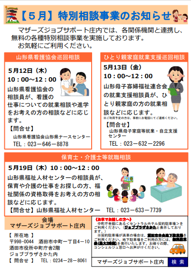 マザーズジョブサポート庄内では、各関係機関と連携し、各種特別相談事業を実施しております。ぜひ、ご利用ください。 山形県看護協会巡回相談 【要予約】日 時 5月12日(木)10:00〜12:00場 所 マザーズジョブサポート庄内 セミナールーム問合せ 山形県看護協会 пF023-646-8878HP:http://www.nurse-yamagata.or.jp/ 看護の仕事への復職をお考えの方、お気軽にご相談ください。 保育士・介護士等就職相談 ※お申し込み不要日 時 5月19日(木)10:00〜12:00場 所 マザーズジョブサポート庄内 セミナールーム問合せ 山形県福祉人材センター пF023-633-7739HP:http://www.ymgt-shakyo.or.jp/jinzai/保育士・介護士・看護師など資格をお持ちの方や、資格取得を目指している方、福祉職にご関心のある方は、お気軽にお越しください。 ひとり親家庭就業支援相談 [要予約]日 時 5月13日(金)10:00〜12:00場 所 マザーズジョブサポート庄内 セミナールーム問合せ 山形県母子家庭等就業・自立支援センター пF023-632-2296HP:http://www.y-boshi.com/self-support/ひとり親家庭の方や今後について考えている方、どうぞお気軽にご相談ください。 ※各相談会について、利用ご希望の方は、マザーズジョブサポート庄内までお気軽にお声掛けください。※ご相談の際、お子さまの託児は『保育ルーム きらきら』をご利用いただけます。託児ルームのご利用には、事前のご登録が必要です。 【駐車場について】お車でお越しの際は、中町庁舎脇にあるセントラルホテル契約駐車場をご利用ください。(ジョブプラザさかたと表示してあります。)※契約駐車場が満車の場合は、酒田市中央地下駐車場をご利用ください。無料駐車券(最大2時間)を発行いたします。お帰りの際に、コンシェルジュ窓口へお声がけください。 ◇お申込み・お問い合わせ◇マザーズジョブサポート庄内TEL:0234-28-8061