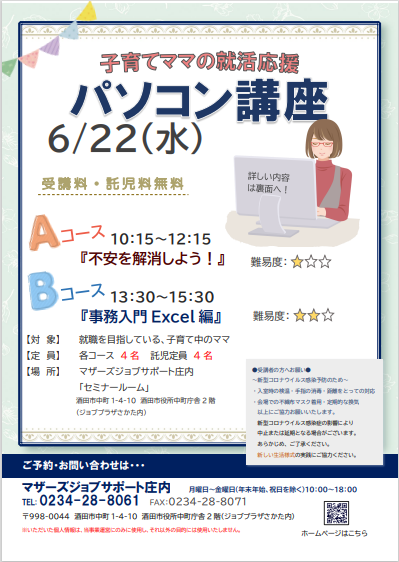 ☆マザーズジョブサポート庄内主催☆ 〜満員御礼〜 A・Bコースとも定員となりました。 ありがとうございます。 キャンセル待ちは受付しておりますので 電話でお問い合わせください。再就職応援『パソコン講座』のお知らせ ≪Aコース≫  6月22日(水)10:15〜12:15『不安を解消しよう!』難易度:★「求人票の"パソコンが使える方"ってどの程度?」「仕事では、どのくらいのスキルが求められるの?」「WordとExcelって、どの程度使えると大丈夫?」などいろいろな不安がありますよね…   パソコンについての"これから"を考えるきっかけに♪ ≪Bコース≫  6月22日(水)13:30〜15:30『事務入門(Excel編)』難易度:★★事務のお仕事にも、一般・経理・労務など様々です。それぞれどのようなパソコン作業があるのかを確認していきます。実際にエクセルで、関数を利用し請求書を作成します。  ♪片方のコースのみ、両方のコース、どちらの受講でも可能です♪※本セミナーは「雇用保険受給中の求職活動実績」として認められます。 ★★受講者の皆様へお願い★★新型コロナウイルス拡大防止のため、・入室時の検温・手指の消毒・距離をとっての対応・会場での不織布マスク着用・定期的な換気以上にご協力お願いいたします。新型コロナウイルス感染症の影響により中止または延期となる場合がございます。あらかじめ、ご了承ください。新しい生活様式の実践にご協力ください。★★ーーーーーーーーーーーー★★【対 象】就職を目指している子育て中のママ※就職活動前で何かを始めたいママもOK【会 場】マザーズジョブサポート庄内 セミナールーム【料 金】受講料 及び 託児料 無料【定 員】先着4名 ※お申込みが必要です。【託 児】定員4名 ※事前登録・予約が必要です。     保育ルーム開室日、水・木・金の     16:00までに登録にお越し下さい。※併設の保育ルームで、保育スタッフが お子さんをお預かりします。 ママは安心して受講いただけます。 【駐車場について】お車でお越しの際は、中町庁舎脇にあるセントラルホテル契約駐車場をご利用ください。(ジョブプラザさかたと表示してあります。)※契約駐車場が満車の場合は、酒田市中央地下駐車場をご利用ください。無料駐車券(最大2時間)を発行いたします。お帰りの際に、コンシェルジュ窓口へお声がけください。 ◇お申込み・お問い合わせ◇マザーズジョブサポート庄内TEL:0234-28-8061