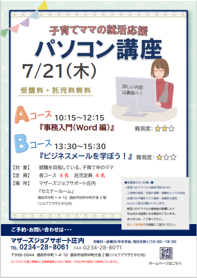 ☆マザーズジョブサポート庄内主催☆ 〜満員御礼〜 A・Bコースとも定員となりました。 ありがとうございます。 キャンセル待ちは受付しておりますので 電話でお問い合わせください。 再就職応援『パソコン講座』のお知らせ ◇7月◇≪Aコース≫ 7月21日(木)10:15〜12:15『事務入門(Word編)』事務のお仕事にも、一般・経理・労務など様々です。それぞれどのようなパソコン作業があるのかを確認していきます。実際にWordを使って、ビジネス文書を作成し、印刷まで行います。 ≪Bコース≫ 7月21日(木)13:30〜15:30『ビジネスメールを学ぼう!』ビジネスメールの基本やマナーを、実際に操作しながら学ぶことができます。仕事がスムーズに進むメールの書き方など、ビジネス上の様々なシーンで役立つ内容をお伝えします。 ♪片方のコースのみ、両方のコース、どちらの受講でも可能です♪※本セミナーは 「雇用保険受給中の求職活動実績」 として認められます。【対 象】就職を目指している子育て中のママ※就職活動前で何かを始めたいママもOK【会 場】マザーズジョブサポート庄内 セミナールーム【料 金】受講料 及び 託児料 無料【定 員】先着4名 ※お申込みが必要です。【託 児】定員4名 ※事前登録・予約が必要です。 保育ルーム開室日【水・木・金】の 10:00〜16:00に登録にお越し下さい。 ※併設の保育ルームで、保育スタッフが お子さんをお預かりします。 ママは安心して受講いただけます。 【駐車場について】お車でお越しの際は、中町庁舎脇にあるセントラルホテル契約駐車場をご利用ください。(ジョブプラザさかたと表示してあります。)※契約駐車場が満車の場合は、酒田市中央地下駐車場をご利用ください。無料駐車券(最大2時間)を発行いたします。お帰りの際に、コンシェルジュ窓口へお声がけください。 ★★受講者の皆様へお願い★★〜新型コロナウイルス感染予防のため〜・入室時の検温・手指の消毒・距離をとっての対応・会場での不織布マスク着用・定期的な換気 以上にご協力お願いいたします。 新型コロナウイルス感染症の影響により 中止または延期となる場合がございます。 あらかじめ、ご了承ください。 新しい生活様式の実践にご協力ください。★★ーーーーーーーーーーーー★★どうぞ、お気軽にお問い合わせくださいね。 ◇お申込み・お問い合わせ◇マザーズジョブサポート庄内TEL:0234-28-8061メールでのお申込みはコチラ